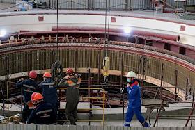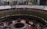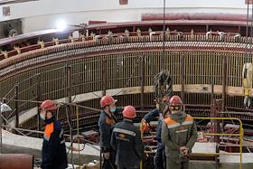 Пресс-тур "20 лет компании En+ Олега Дерипаски". Иркутская гидроэлектростанция (Иркутская ГЭС) на реке Ангаре в Свердловском округе города Иркутска. Жанровая фотография. Машинный зал станции.