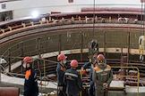 Пресс-тур "20 лет компании En+ Олега Дерипаски". Иркутская гидроэлектростанция (Иркутская ГЭС) на реке Ангаре в Свердловском округе города Иркутска. Жанровая фотография. Сотрудники ГЭС В машинном зале.