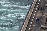 Пресс-тур "20 лет компании En+ Олега Дерипаски". Иркутская гидроэлектростанция (Иркутская ГЭС) на реке Ангаре в Свердловском округе города Иркутска. Жанровая фотография. Сотрудники станции на территории ГЭС. Плотина.