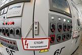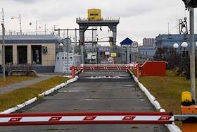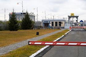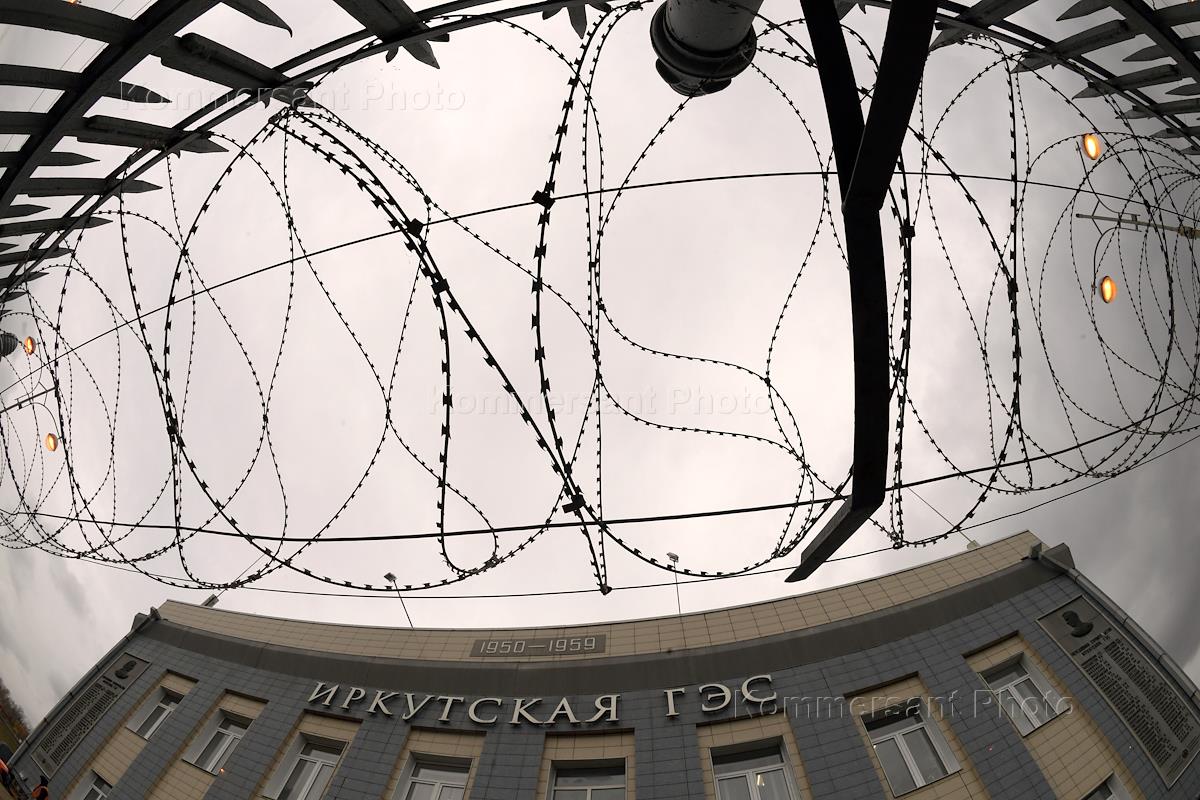 Пресс-тур "20 лет компании En+ Олега Дерипаски". Виды Иркутской гидроэлектростанции (Иркутская ГЭС) на реке Ангаре в Свердловском округе города Иркутска. Жанровая фотография. Шлагбаум на въезде на территорию ГЭС.