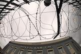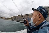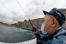 Пресс-тур "20 лет компании En+ Олега Дерипаски". Виды Иркутской гидроэлектростанции (Иркутская ГЭС) на реке Ангаре в Свердловском округе города Иркутска. Жанровая фотография. Сотрудник охраны на территорию ГЭС.