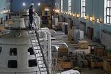 Пресс-тур "20 лет компании En+ Олега Дерипаски". Иркутская гидроэлектростанция (Иркутская ГЭС) на реке Ангаре в Свердловском округе города Иркутска. Жанровая фотография. Машинный зал гидроэлектростанции.