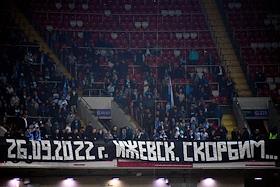 Fonbet - Russian Football Cup 2022/23. Match between the teams "Spartak" (Moscow) - "Zenit" (St. Petersburg) at the stadium "Otkritie Bank Arena". Banner in memory of those who died during the attack on a school in Izhevsk on September 26, 2022.