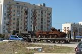 Жанровая фотография. Сгоревший бронетранспортер на автомобильной платформе во время перевозки.
