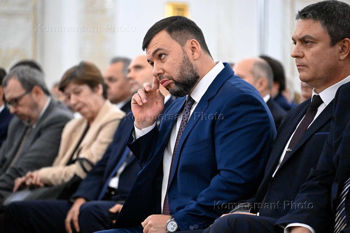 Церемония подписания договоров о вхождении в состав России Донецкой и Луганской народных республик, а также Херсонской и Запорожской областей в Большом Кремлевском дворце. Глава Донецкой Народной Республики (ДНР) Денис Пушилин (в центре) и глава Луганской Народной Республики Леонид Пасечник (справа) во время церемонии.