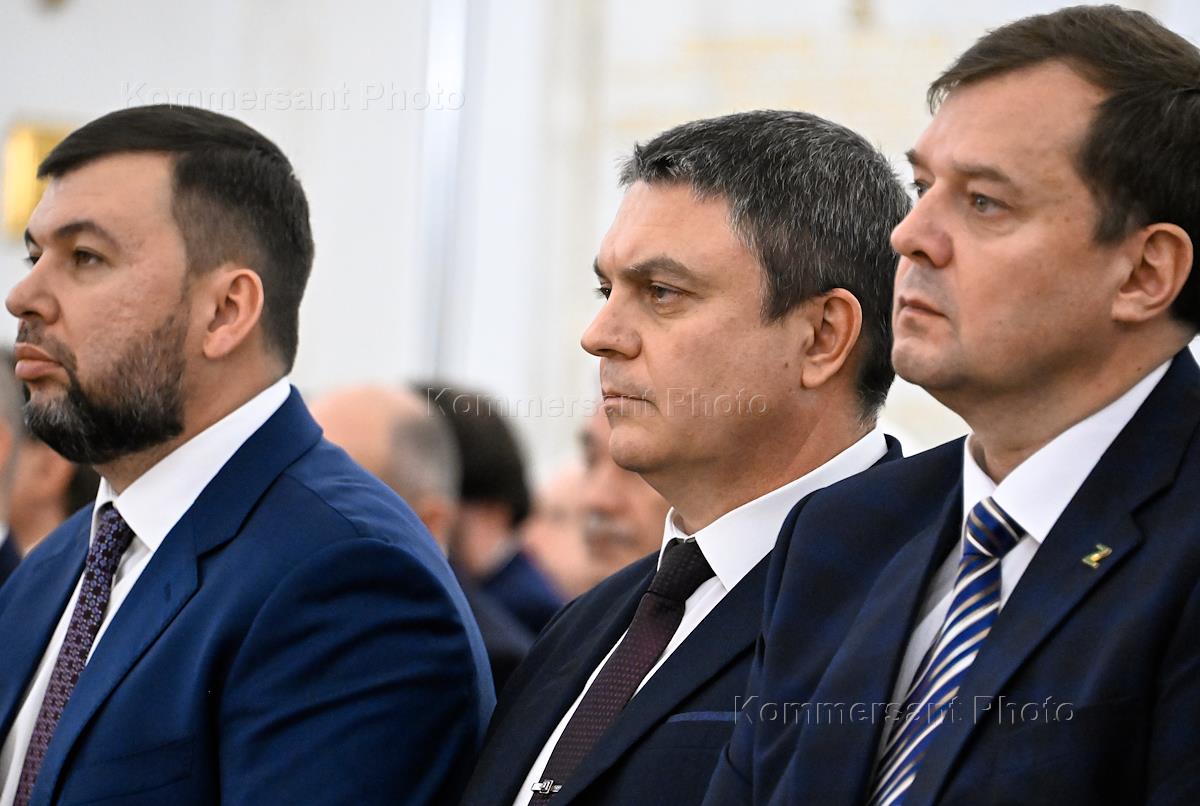 Церемония подписания договоров о вхождении в состав России Донецкой и Луганской народных республик, а также Херсонской и Запорожской областей в Большом Кремлевском дворце. Слева направо: глава Донецкой Народной Республики (ДНР) Денис Пушилин, глава Луганской Народной Республики (ЛНР) Леонид Пасечник и глава администрации (ВГА) Запорожской области Евгений Балицкий во время церемонии.