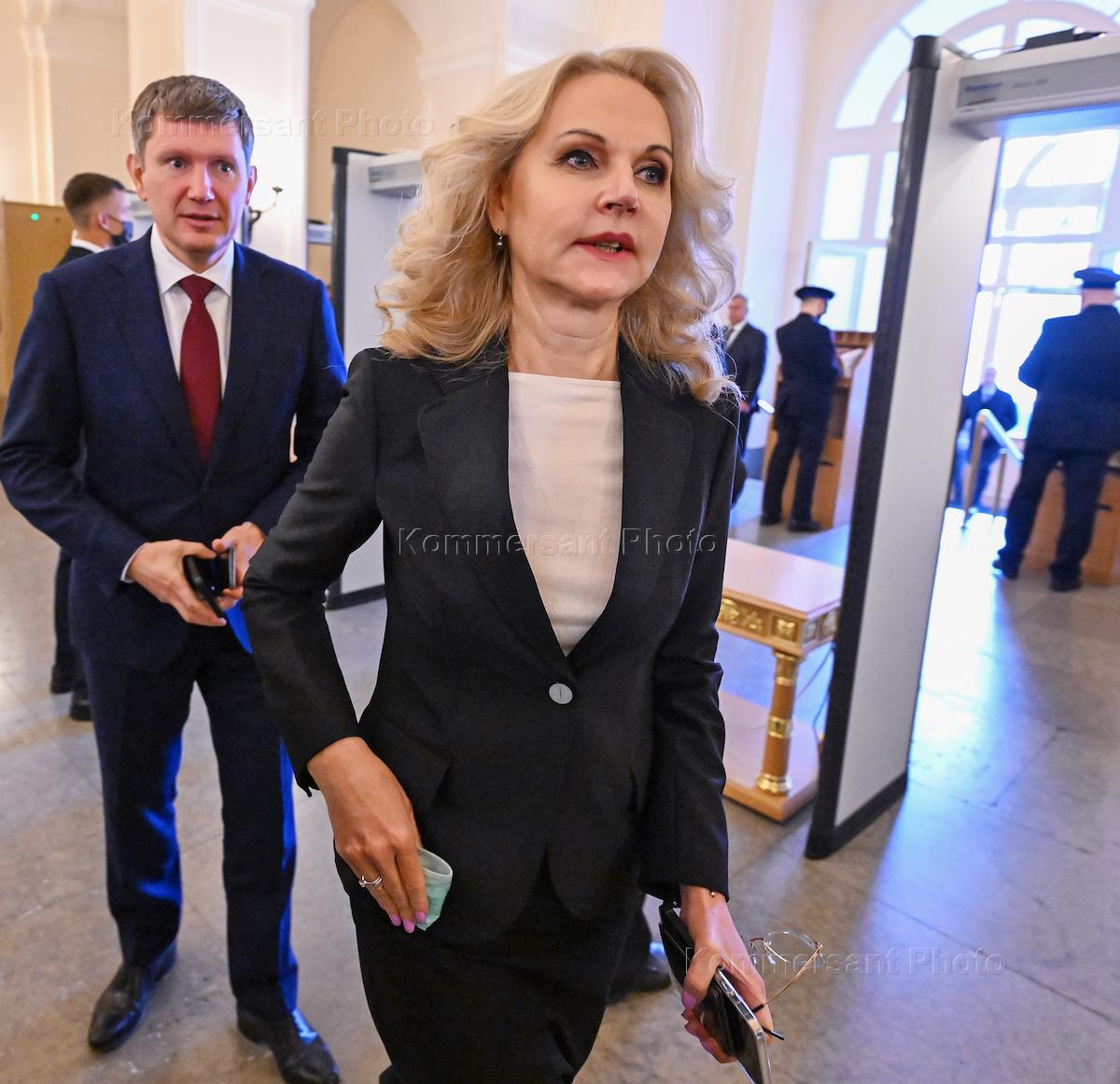 Церемония подписания договоров о вхождении в состав России Донецкой народных республик (ДНР), Луганской народных республик (ЛНР), Херсонской и Запорожской областей в Большом Кремлевском дворце. Министр экономического развития России Максим Решетников (слева) и заместитель председателя правительства России Татьяна Голикова (справа) перед началом церемонии.