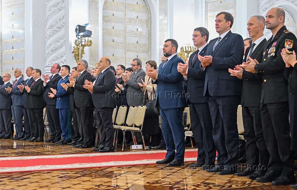 Церемония подписания договоров о вхождении в состав России Донецкой и Луганской народных республик, а также Херсонской и Запорожской областей в Большом Кремлевском дворце. Глава Донецкой Народной Республики (ДНР) Денис Пушилин (в центре) и глава Луганской Народной Республики Леонид Пасечник (справа) во время церемонии.