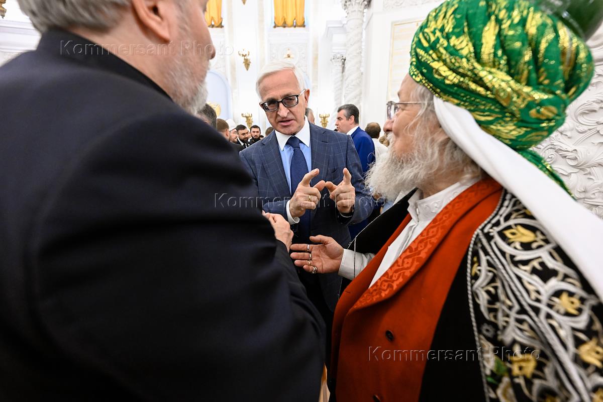 Церемония подписания договоров о вхождении в состав России Донецкой и Луганской народных республик, а также Херсонской и Запорожской областей в Большом Кремлевском дворце. Президент Российского союза промышленников и предпринимателей (РСПП) Александр Шохин (в центре) во время церемонии.
