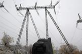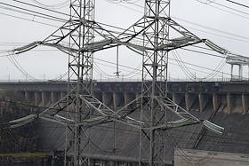Пресс-тур "20 лет компании En+ Олега Дерипаски". Виды гидроэлектростанция "Братская ГЭС" (им. 50-летия Великого Октября) на реке Ангаре в городе Братске Иркутской области. Жанровая фотография. Линии элекропередачи (ЛЭП) вблизи гидроэлектростанции.