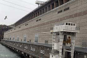 Пресс-тур "20 лет компании En+ Олега Дерипаски". Виды гидроэлектростанция "Братская ГЭС" (им. 50-летия Великого Октября) на реке Ангаре в городе Братске Иркутской области. Жанровая фотография. Водопад.