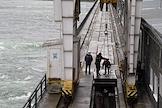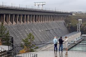 Пресс-тур "20 лет компании En+ Олега Дерипаски". Виды гидроэлектростанция "Братская ГЭС" (им. 50-летия Великого Октября) на реке Ангаре в городе Братске Иркутской области. Жанровая фотография. Люди на смотровой площадке ГЭС.