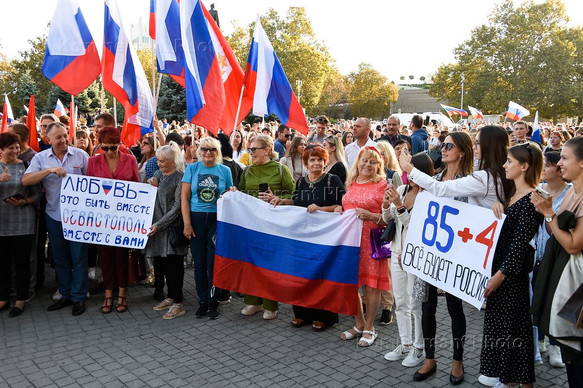 Митинг-концерт в поддержку вхождения ДНР, ЛНР, Херсонской и Запорожской областей в состав России на площади Нахимова. Участники во время митинга-концерта.