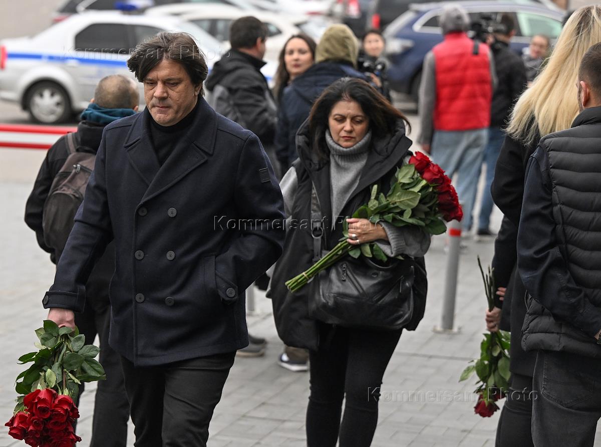 Farewell ceremony for singer Boris Moiseev at Troyekurovo funeral home. Singer Igor Nadzhiev with his wife Alla before the ceremony.