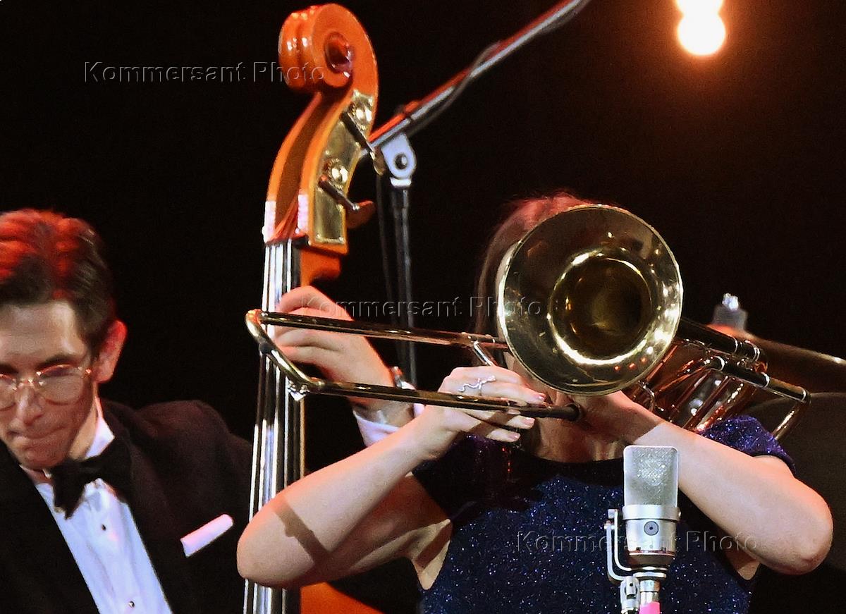 Гала-концерт, посвященный празднованию Столетия Российского джаза, на сцене Государственного академического Большого театра (ГАБТ). Певица Фантине и джазмен Игорь Бутман во время концерта. Вокалистка Уральского диксиленда Игоря Бурко Кристина Рыжковская во время выступления диксиленда.