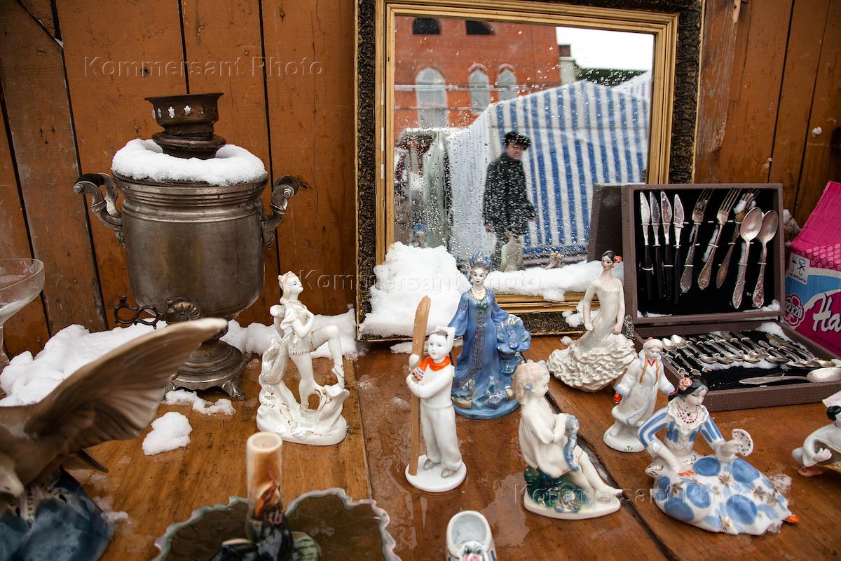 Жанровая фотография. Старинные фарфоровые статуэтки и самовар на блошином рынке.