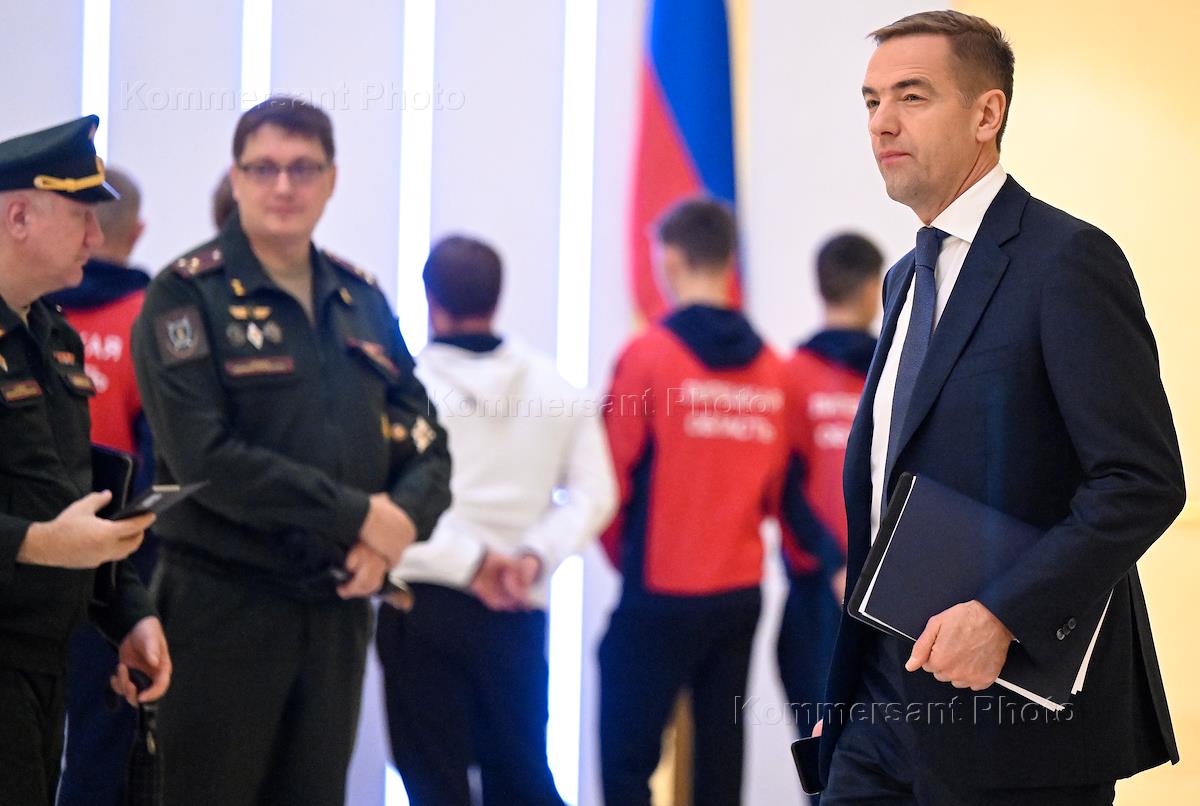 Parliamentary hearings on the topic: "On the parameters of the draft federal budget for 2023 and for the planning period of 2024 and 2025" in the Federation Council of Russia. Governor of the Kaluga Region Vladislav Shapsha before the start of the hearings.