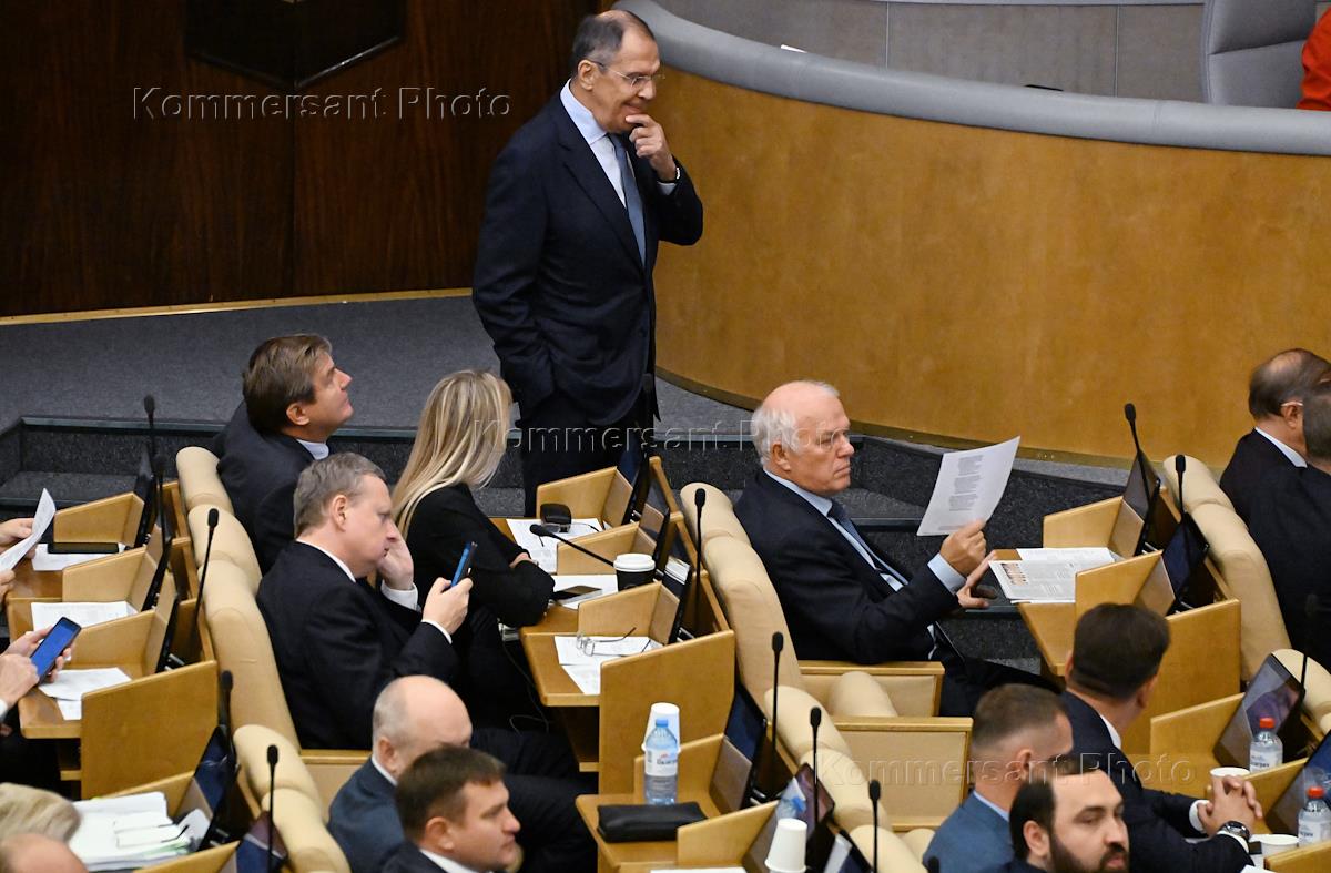 Внеочередное пленарное заседание Государственной думы (ГД) России. Министр иностранных дел России Сергей Лавров (в центре) во время заседания.
