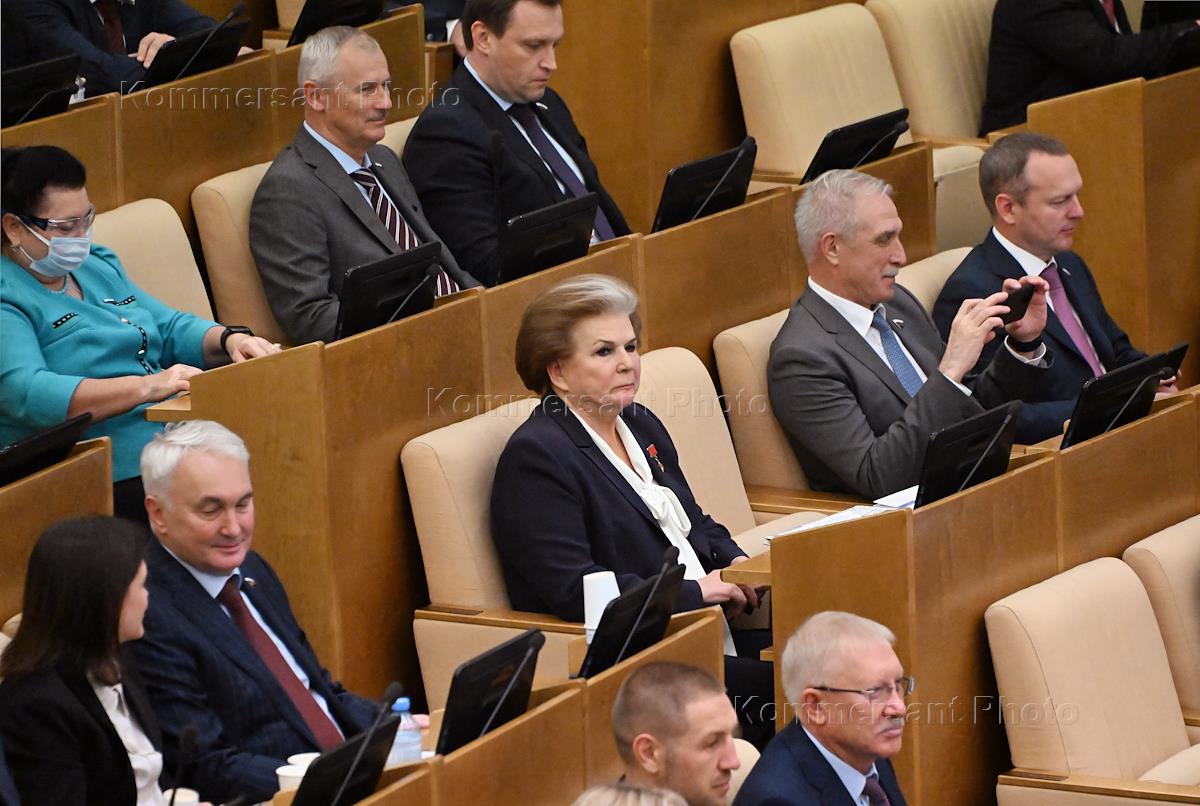 Внеочередное пленарное заседание Государственной думы (ГД) России. Заместитель председателя комитета ГД России по федеративному устройству и вопросам местного самоуправления Валентина Терешкова (в центре) во время заседания.