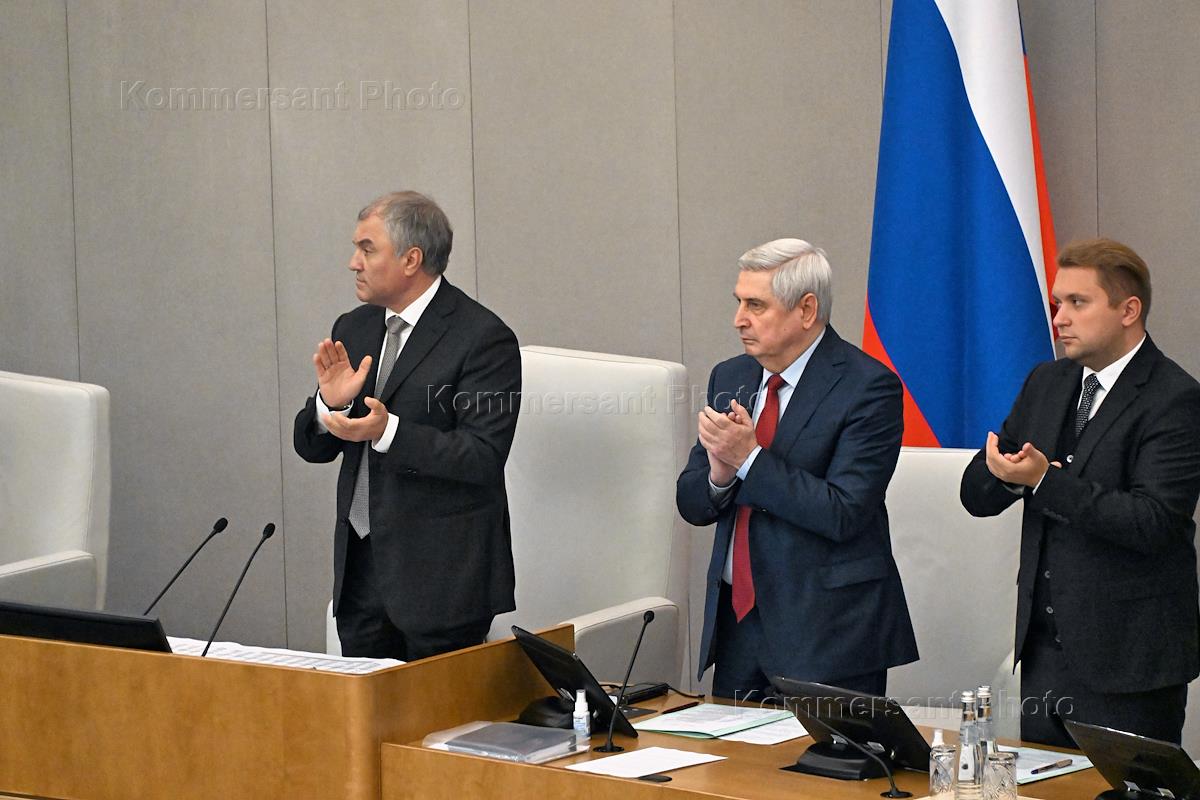 Extraordinary plenary session of the State Duma of Russia. From left to right: Chairman of the State Duma of Russia Vyacheslav Volodin, First Deputy Chairman of the State Duma of Russia Ivan Melnikov and Deputy Chairman of the State Duma of Russia Boris Chernyshov during the meeting.