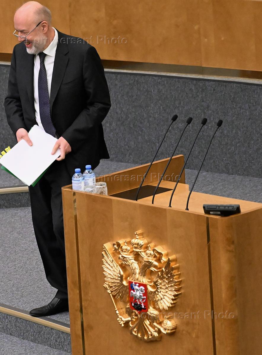 Extraordinary plenary session of the State Duma of Russia. Member of the Russian State Duma Committee on Ecology, Natural Resources and Environmental Protection Timofey Bazhenov (right) during the meeting.
