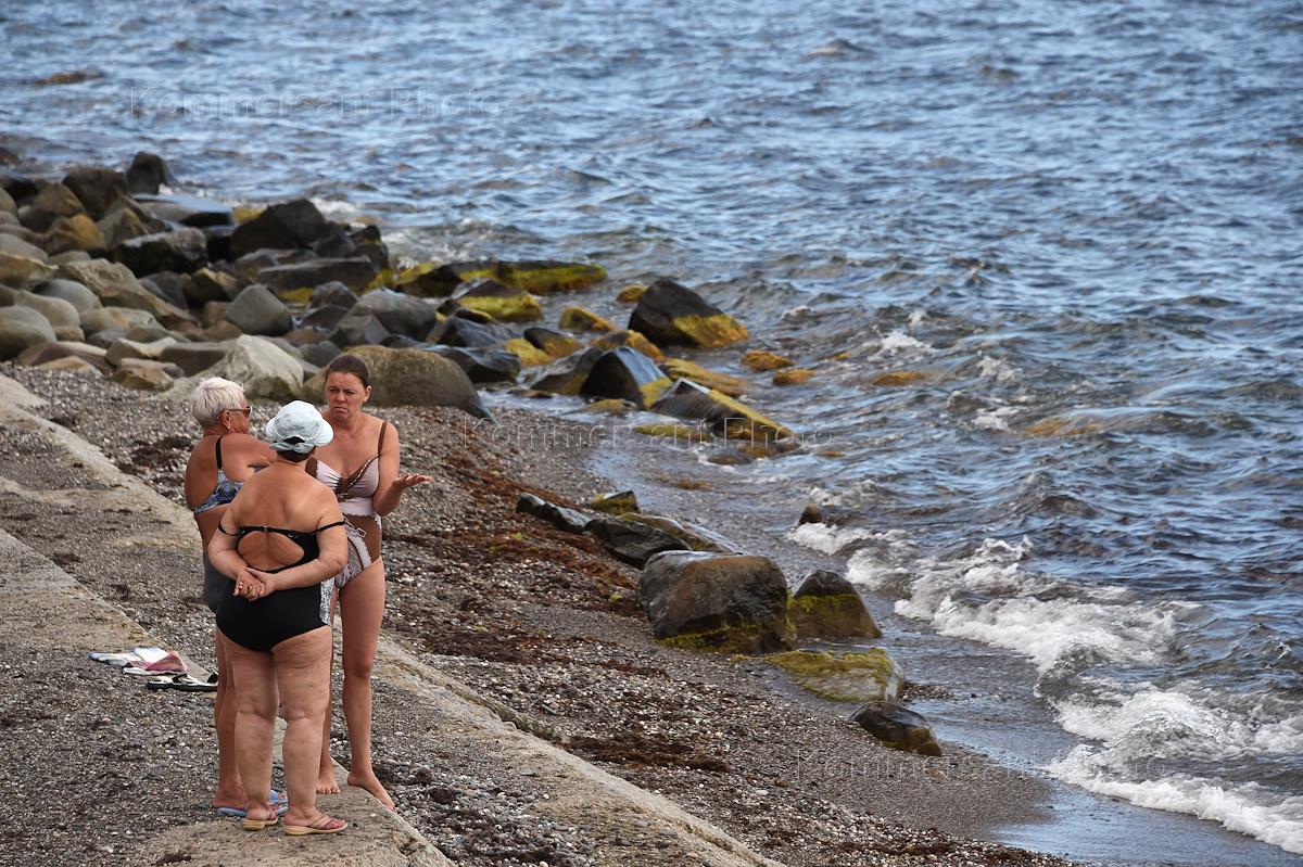 Velvet season in Crimea. Views of Alushta. Fishermen with fishing rods on the beach.