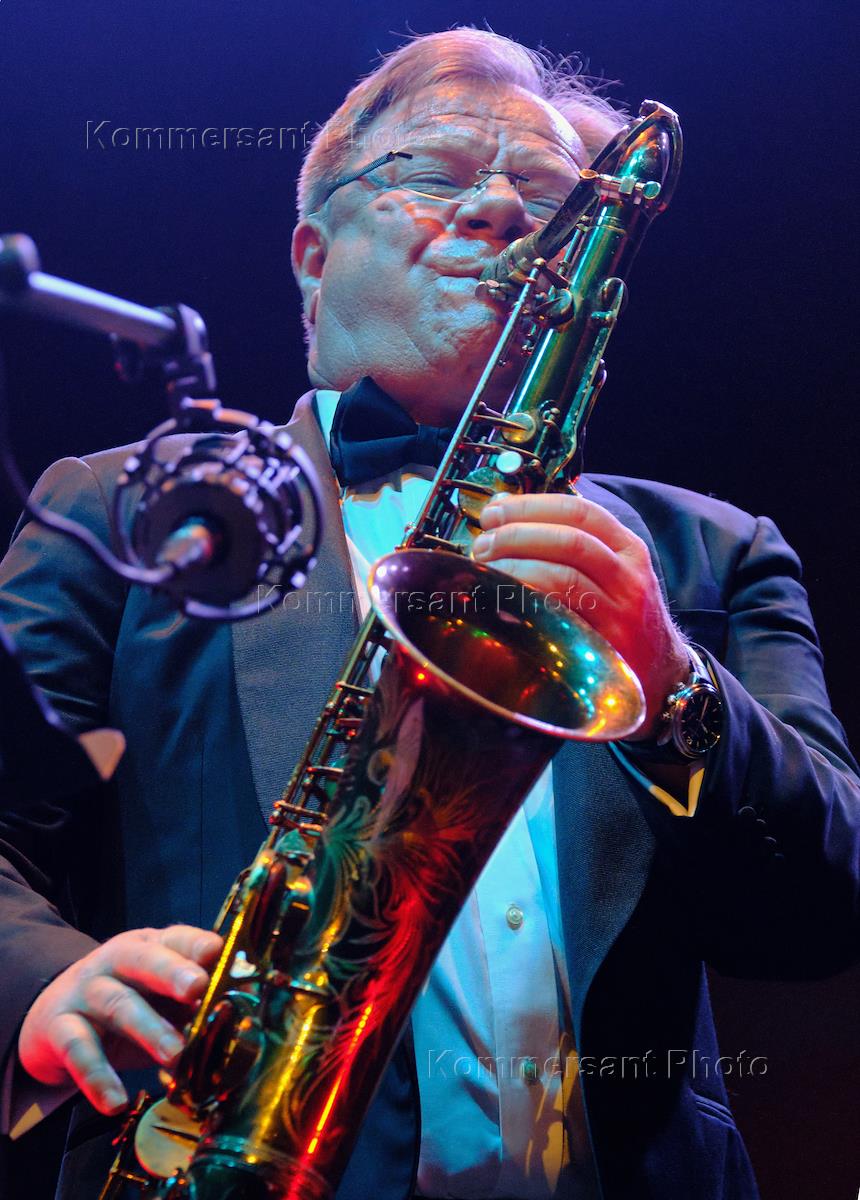 Concert dedicated to the 100th anniversary of Russian jazz on the stage of the sports and entertainment complex "M-1 Arena". Musician Igor Butman (left) during the concert.