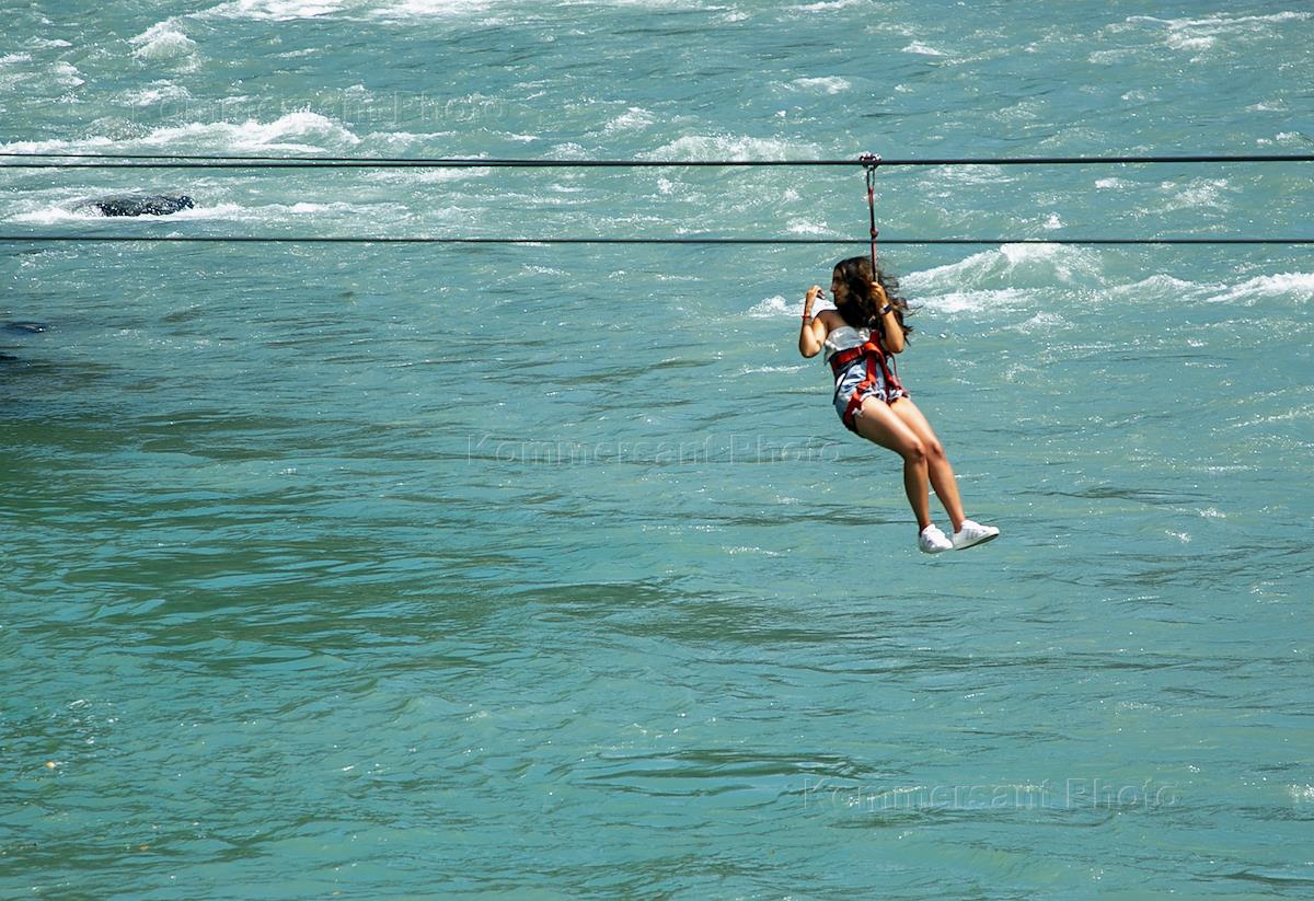 Views of Abkhazia. Genre photography. Tourists on the zipline ride on the Bzyb River.