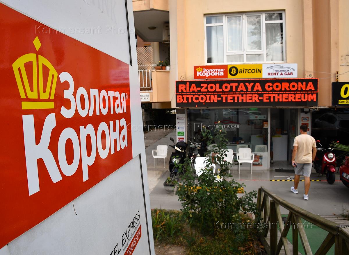 Views of Antalya. Genre photography. Signboard of the point of receiving money transfers "Zolotaya Korona".