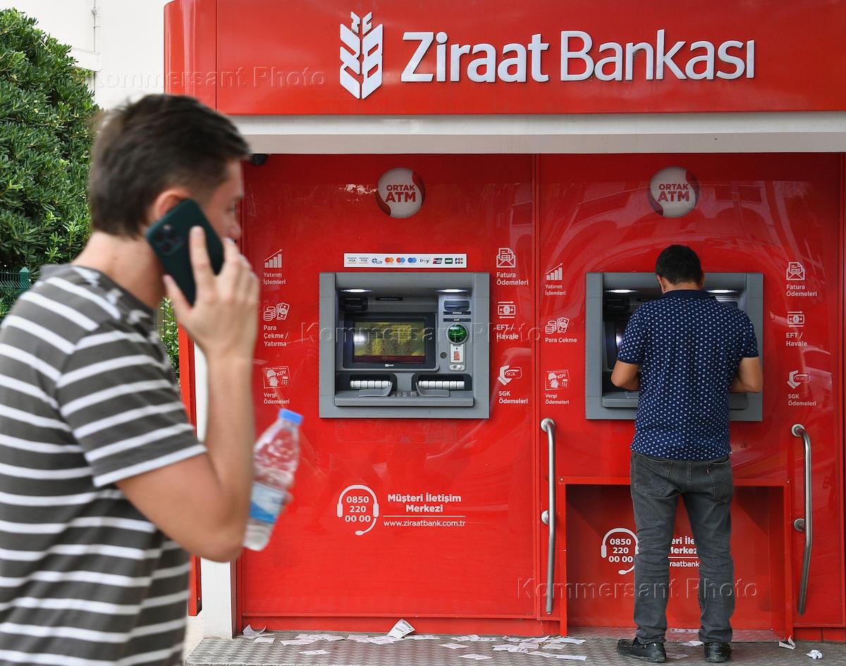 Views of Antalya. Genre photography. People at ATMs on the street.