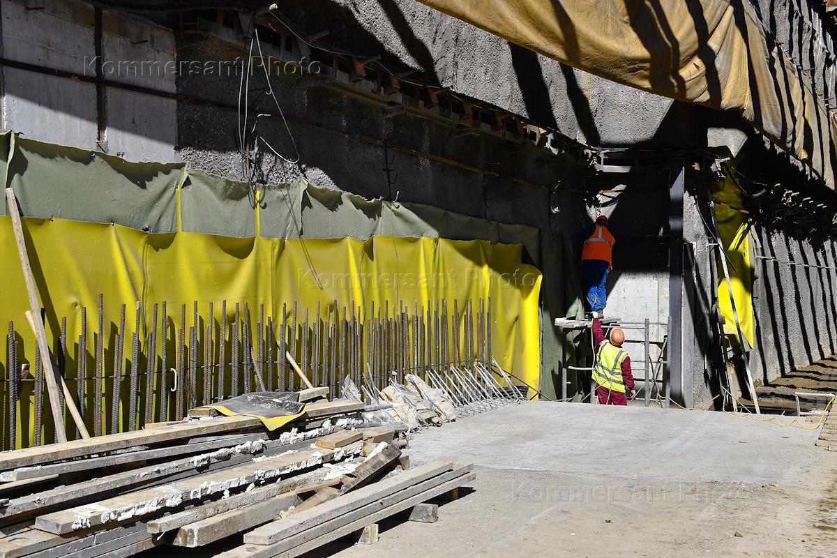 Строительство железной дороги Восточного полигона в границах Владивостокского территориального управления ОАО "РЖД". Жанровая фотография. Рабочие в тоннеле.