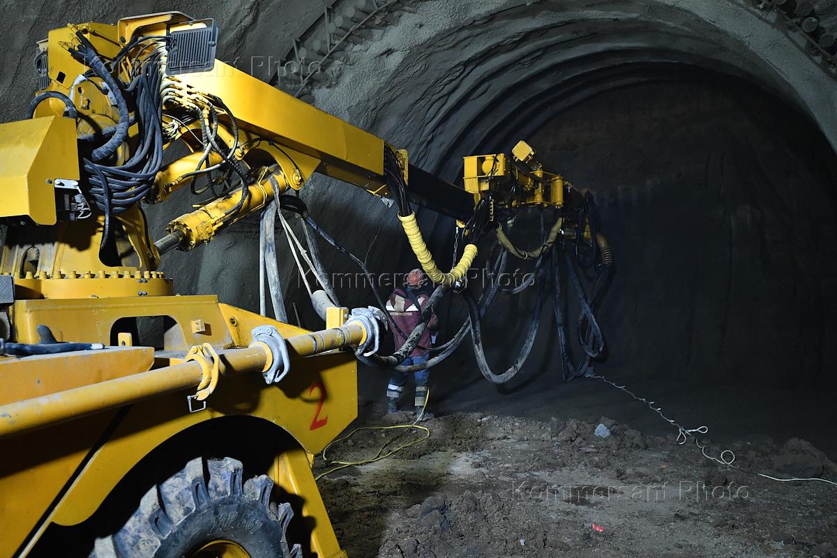 Строительство железной дороги Восточного полигона в границах Владивостокского территориального управления ОАО "РЖД". Жанровая фотография. Рабочие во время прокладки тоннеля.