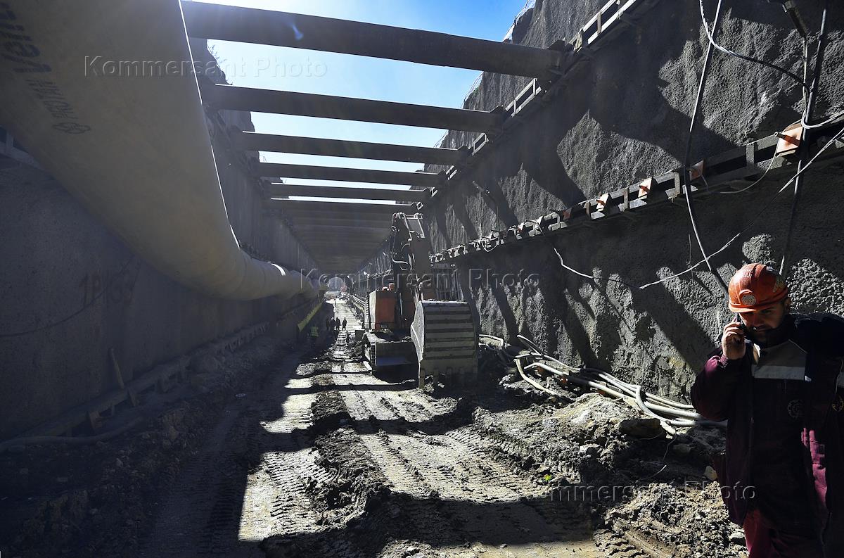 Construction of the railway of the Eastern range within the boundaries of the Vladivostok Territorial Administration of Russian Railways. Genre photography. Workers in the tunnel.