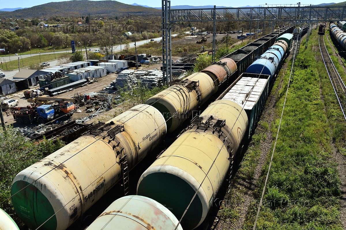 Жанровая фотография. Товарные поезда на железнодорожной станции Смоляниново.