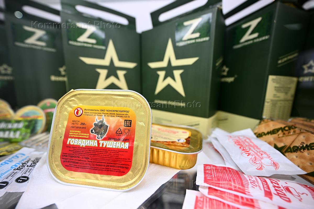 XXIV Всероссийская агропромышленная выставка "Золотая Осень" на площадке Конгрессно-выставочного центра "Патриот". Жанровая фотография. Упаковки готовой еды для военнослужащих "Армия России".