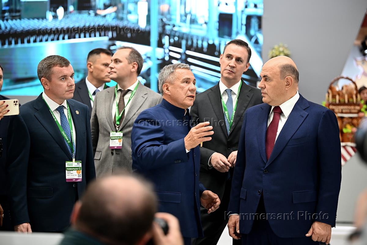 XXIV Всероссийская агропромышленная выставка "Золотая Осень" на площадке Конгрессно-выставочного центра "Патриот". Президент республики Татарстан Рустам Минниханов (третий слева), председатель правительства России Михаил Мишустин (второй справа) и министр сельского хозяйства России Дмитрий Патрушев (в центре) во время осмотра выставки.