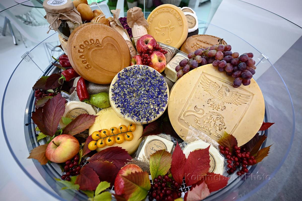 XXIV Всероссийская агропромышленная выставка "Золотая Осень" на площадке Конгрессно-выставочного центра "Патриот". Жанровая фотография. Сыр в ассортименте на блюде.