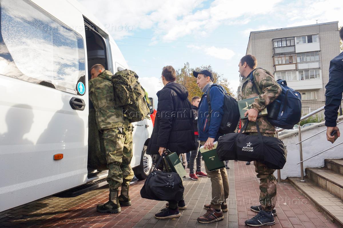 Partial mobilization in Dzerzhinsk. Genre photography. Sending mobilized citizens for military service.