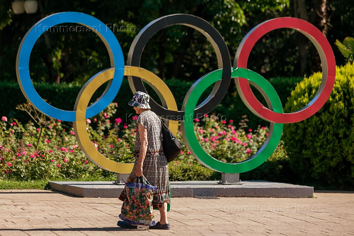 Виды Сочи. Жанровая фотография. Пожилая женщина на фоне олимпийских колец.