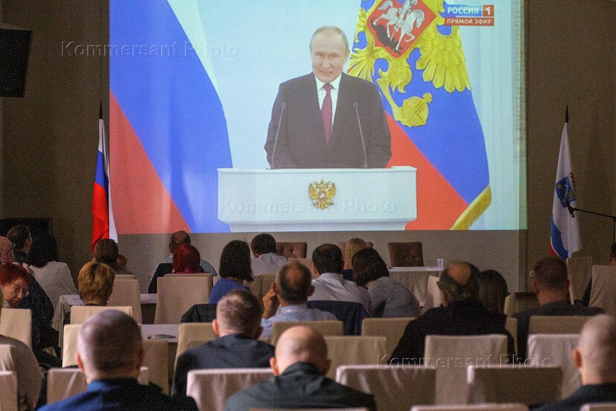 Forum of municipal public chambers, public councils and non-profit organizations of the Leningrad region "All for Victory" at the resort "Zolotaya Dolina". Forum participants watching the broadcast of the ceremony of signing agreements on joining the Donetsk and Luhansk People's Republics, Kherson and Zaporozhye regions into Russia.