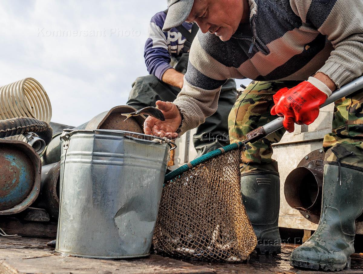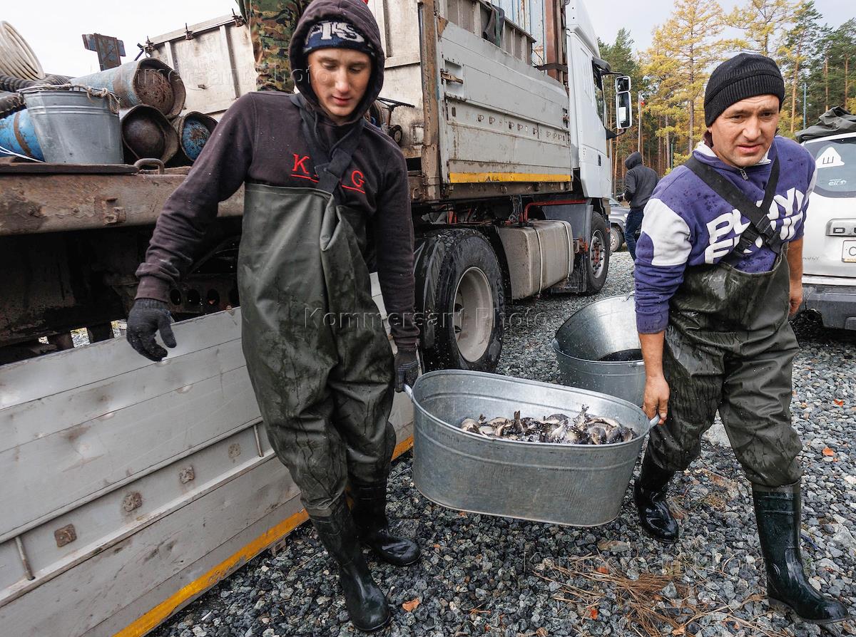 Stocking of the Volchikhinsky reservoir to replenish the population of aquatic life. Release of young carp.