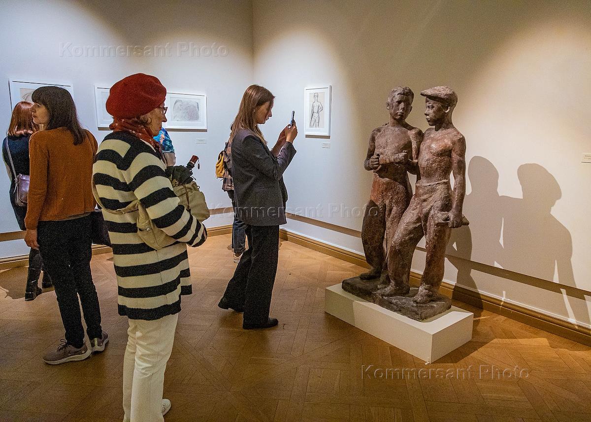Press show of the exhibition "Naum Mogilevsky. Sculpture and Graphics" in the Mikhailovsky Castle of the State Russian Museum. Visitors at the exhibition.