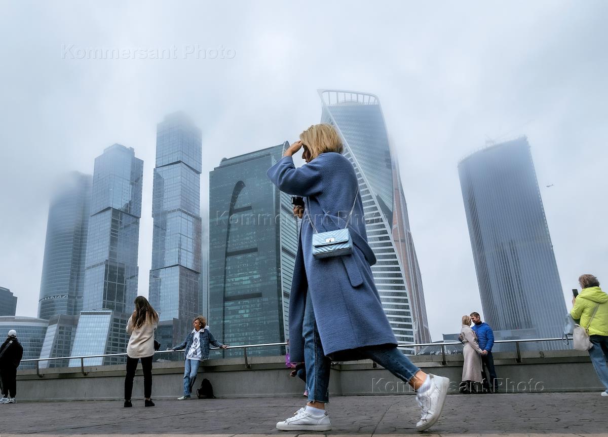 Views of Moscow. Genre photography. Passers-by on the embankment against the backdrop of the buildings of the Moscow International Business Center "Moscow-City".