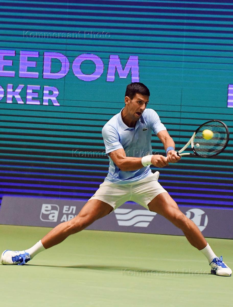 Tennis tournament Astana Open at the National Tennis Center of Astana. Serbian tennis player Novak Djokovic during the match with Russian tennis player Karen Khachanov.