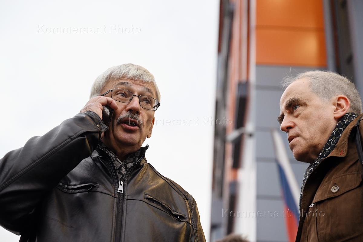 Оглашение приговора по рассмотрению искового заявления заместителя генерального прокурора России об обращении в доход государства имущества научно-исследовательского и просветительского центра (НИПЦ) "Мемориал" - организации ликвидированного общества "Международный "Мемориал" (признано в России НКО-иноагентом) в Тверском районном суде. Председатель совета правозащитного центра "Мемориал" Олег Орлов (слева) перед началом заседания суда.