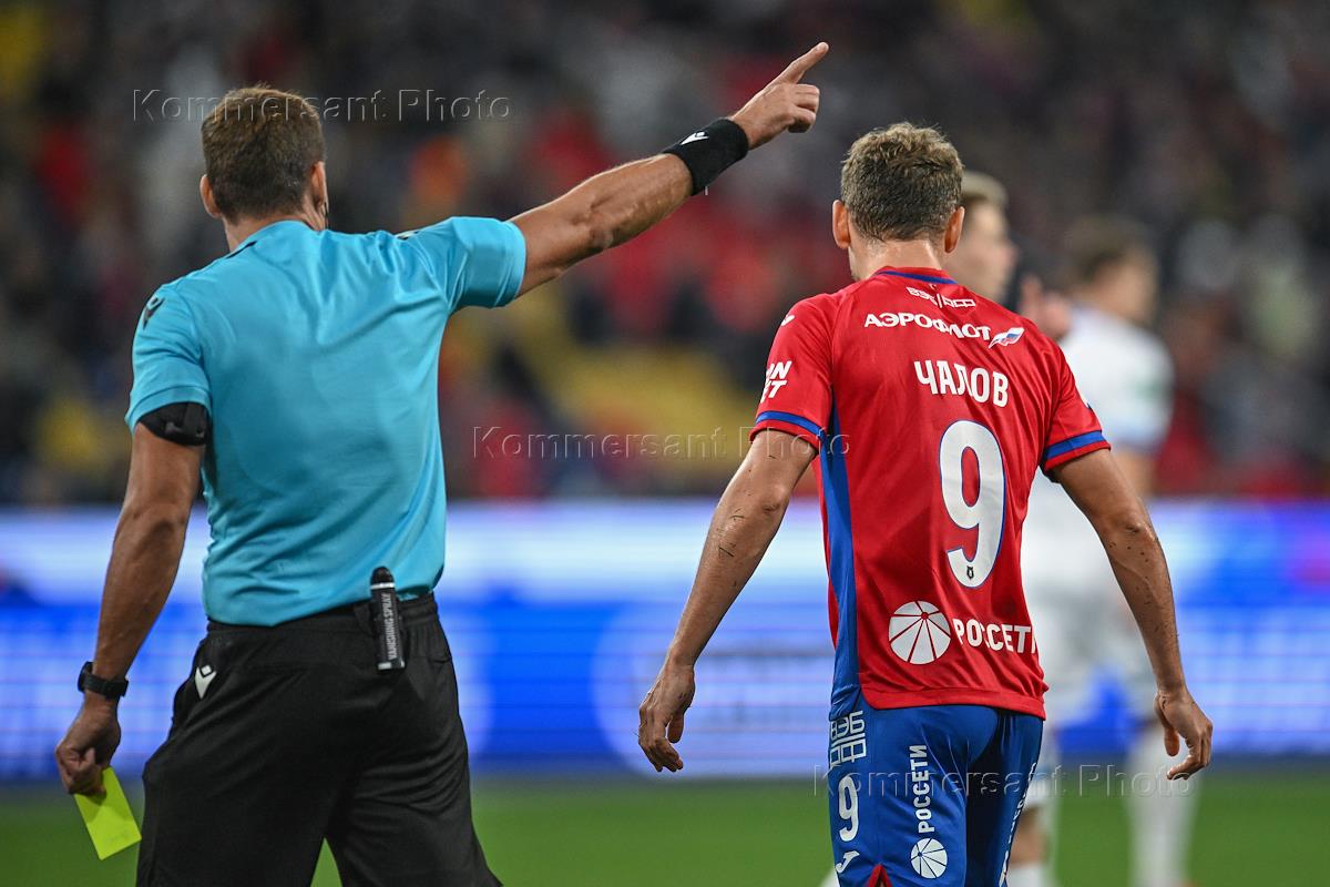 Российская Премьер-Лига (РПЛ). МИР - Чемпионат России по футболу 2022/2023. 12-й тур. Матч между командами ЦСКА (Москва) - "Динамо" (Москва) на стадионе "ВЭБ Арена". Игрок команды ЦСКА Федор Чалов (справа) во время матча.