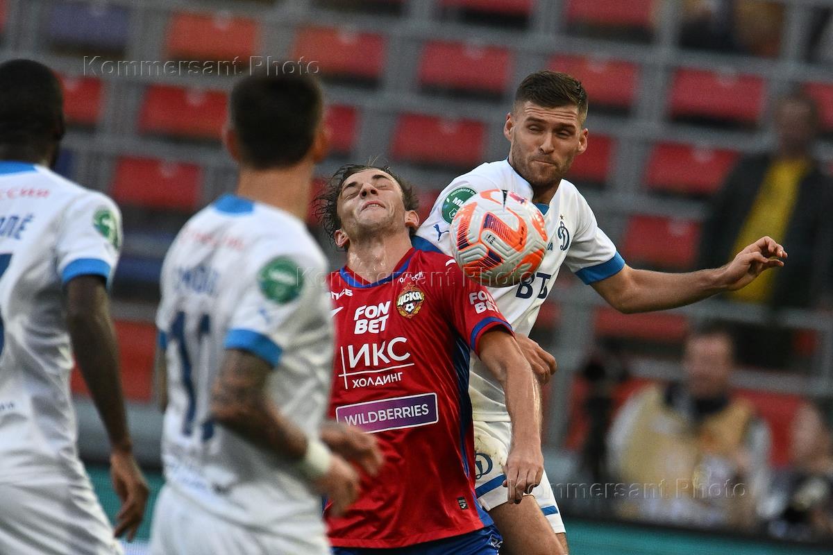 Российская Премьер-Лига (РПЛ). МИР - Чемпионат России по футболу 2022/2023. 12-й тур. Матч между командами ЦСКА (Москва) - "Динамо" (Москва) на стадионе "ВЭБ Арена". Игрок команды ЦСКА Федор Чалов (справа) во время матча.