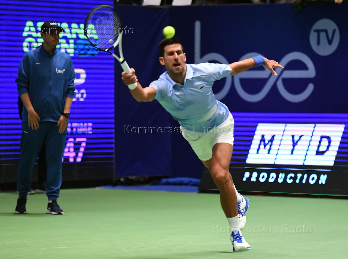 Tennis tournament Astana Open at the National Tennis Center of Astana. Serbian tennis player Novak Djokovic during the match with Russian tennis player Daniil Medvedev.