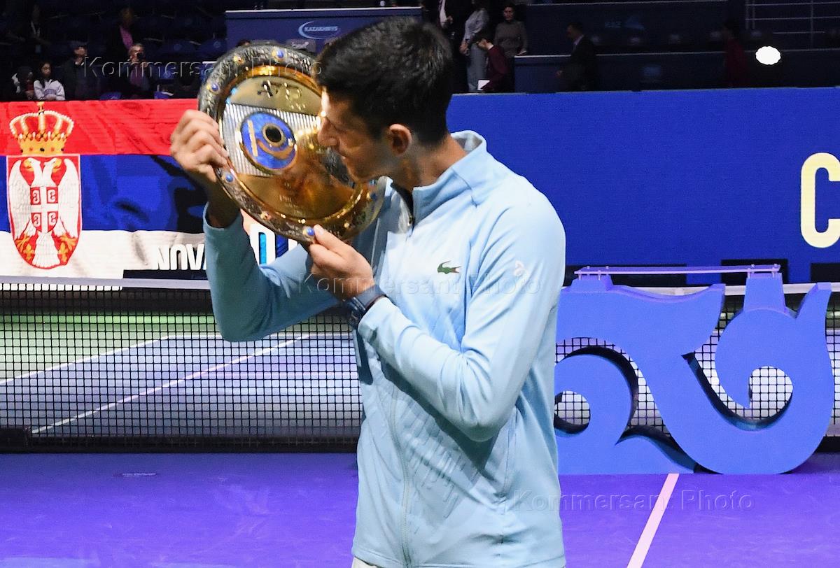 Теннисный турнир Astana Open в Национальном теннисном центре Астаны. Финал. Сербский теннисист Новак Джокович во время церемонии награждения.