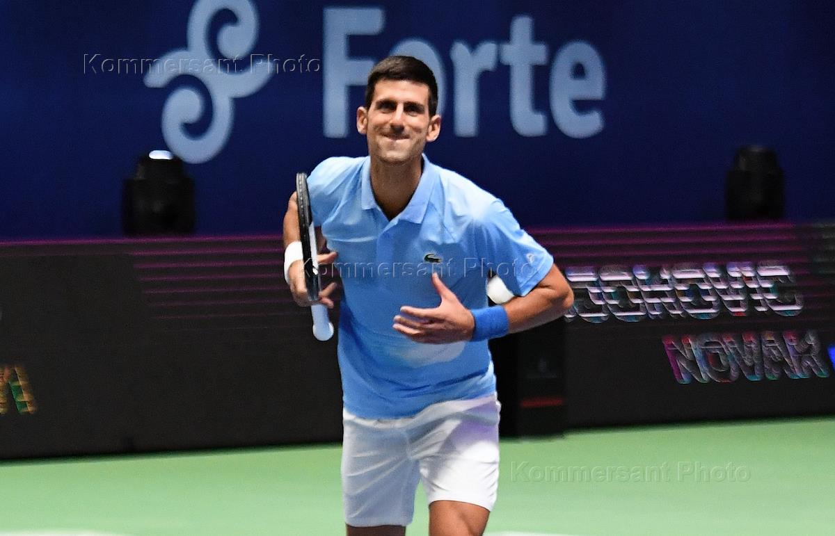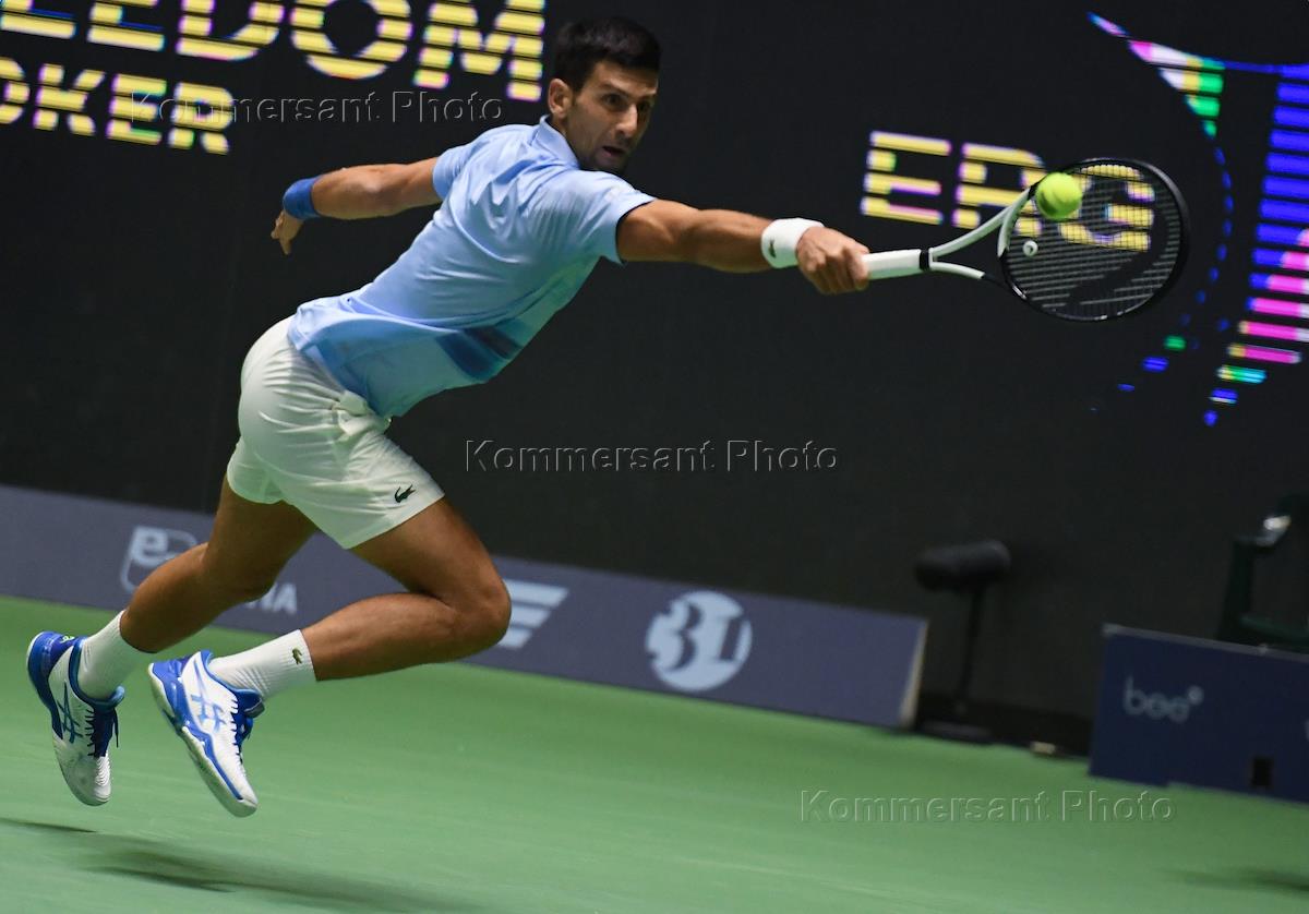 Теннисный турнир Astana Open в Национальном теннисном центре Астаны. Финал. Сербский теннисист Новак Джокович перед матчем с греческим теннисистом Стефаносом Циципасом.